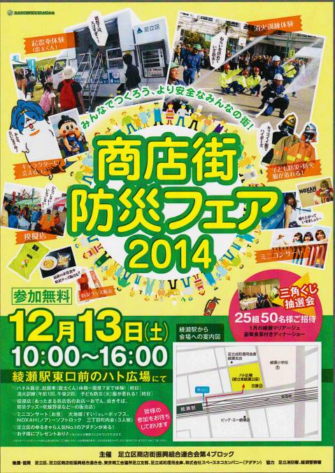 2014年11月25日頃から足立区内に配布(ポスト投函)されている 「商店街まっぷ 保存版 防災マップ付」は今年の夏頃からお店を1件1件周り 商店街のイベント 朝一、フリーマーケット、秋の味覚まつりなどを撮影した写真200枚以上掲載の見応えある商店街のパンフレットです。 綾瀬五丁目商店街・サンアヤセ商店街(メルヘンロード)・綾瀬商店街(綾瀬中央銀座)・綾瀬西口本通り会・綾瀬二丁目商店会・しょうぶ沼商店街(寄り道モール) ・東和銀座商店街(アモール東和)・大谷田三丁目商店会・大谷田商店街(すずらん通り)・六木団地商店街 ( 順不同 ) 今回の撮影にあたり関係者各位の皆様には多大なご支援とご協力を頂きまして心より感謝しております。また沢山の思い出を有り難うございます。 そしてこれら200枚以上の写真を今回撮影させて頂きました。写真担当:青木隆宏です。本当にありがとうございました。
