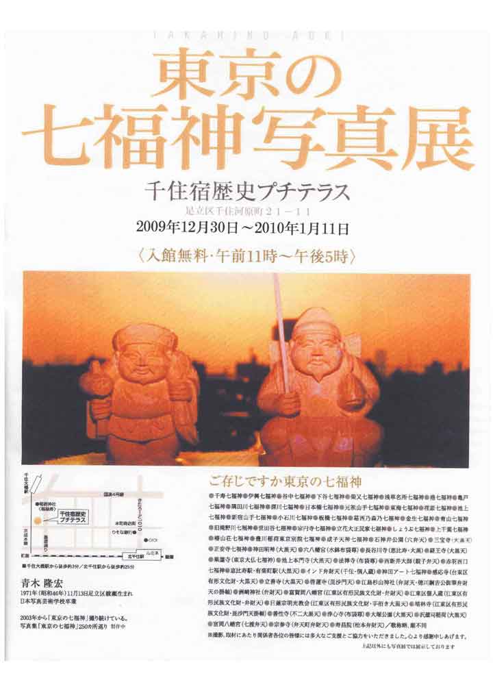 足立区千住宿歴史プチテラスで「東京の七福神写真展」を開催してます。 23区及び多摩西部、多摩南部、多摩北部、そして大島まで津々浦々と 七福神の写真を展示。 それだけではない、神奈川県、埼玉県、千葉県、の七福神も展示スペースがあれば展示予定。 300枚を超える神々の写真展 神社仏閣で代代守られてきた、秘蔵の七福神の写真展です。 拝む七福神の写真を展示する罪をお許しください、七難即滅七福即生。 撮影:青木隆宏 場所:千住宿歴史プチテラス 足立区千住河原町21-11 入館無料