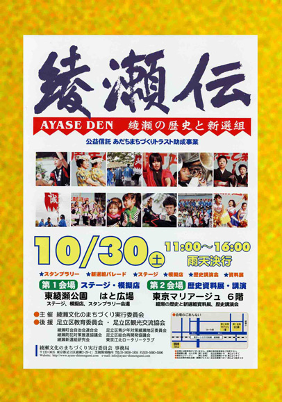 他にも、綾瀬歴史資料展、お茶会、歴史講演会をやるそうです。私は個人的に増田光明先生の  「坂本竜馬と新撰組」の講演楽しみにしてます。